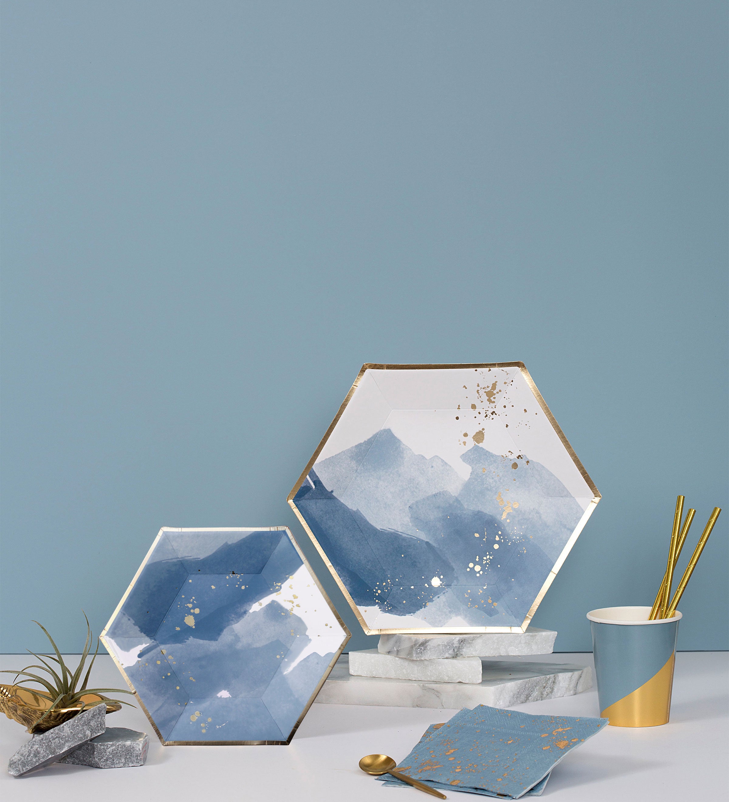 Inspired by blue California waves at dusk, our Malibu Collection features soft washes of watercolor with splashes of gleaming gold.