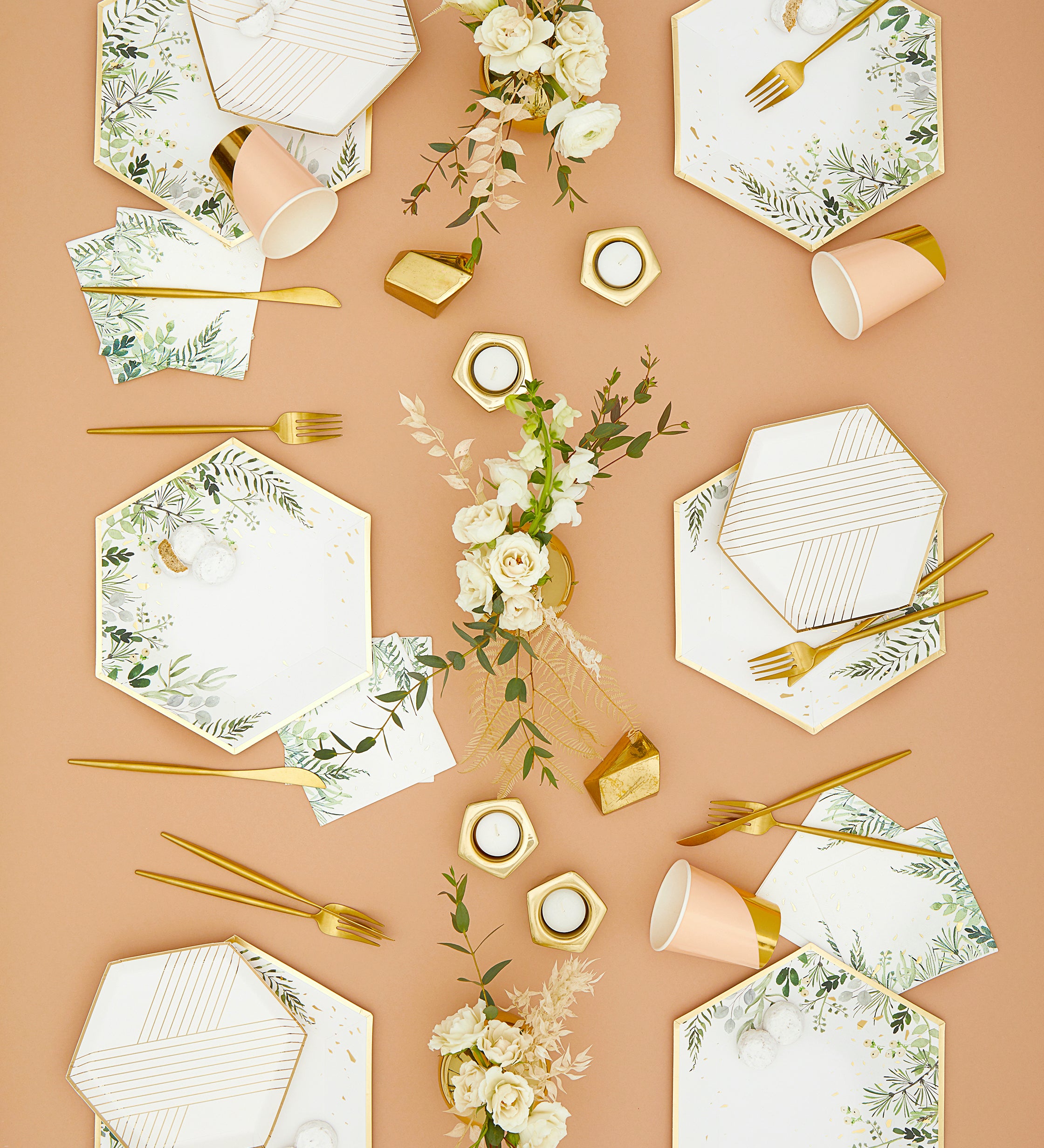 The Secret Garden collection by Harlow & Grey is inspired by lush botanical gardens, perfect for an afternoon garden party or an elegant soirée. Relaxed and feminine with eucalyptus & sage green botanicals with accents of gold foil, our Secret Garden party plates are perfect for your next special celebration.
