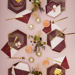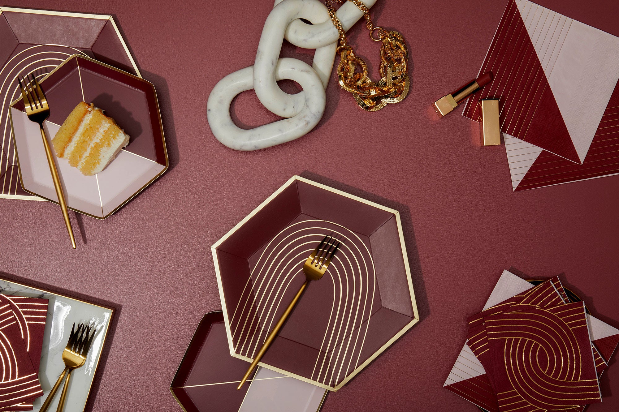 Bold yet understated, our maroon and pink hexagon party plates are adorned with delicate gold lines and are perfectly made for baby showers, wedding events, milestone birthdays, special occasions and holidays!