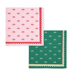 Our large napkins, measuring 6.5 inches, come in a pack with two delightful colorways - green & pink, and pink & red (10 of each, totaling 20 napkins). Each napkin features a delicate lace design adorned with bows and gold foil details, beautifully tied together with a dainty bow.