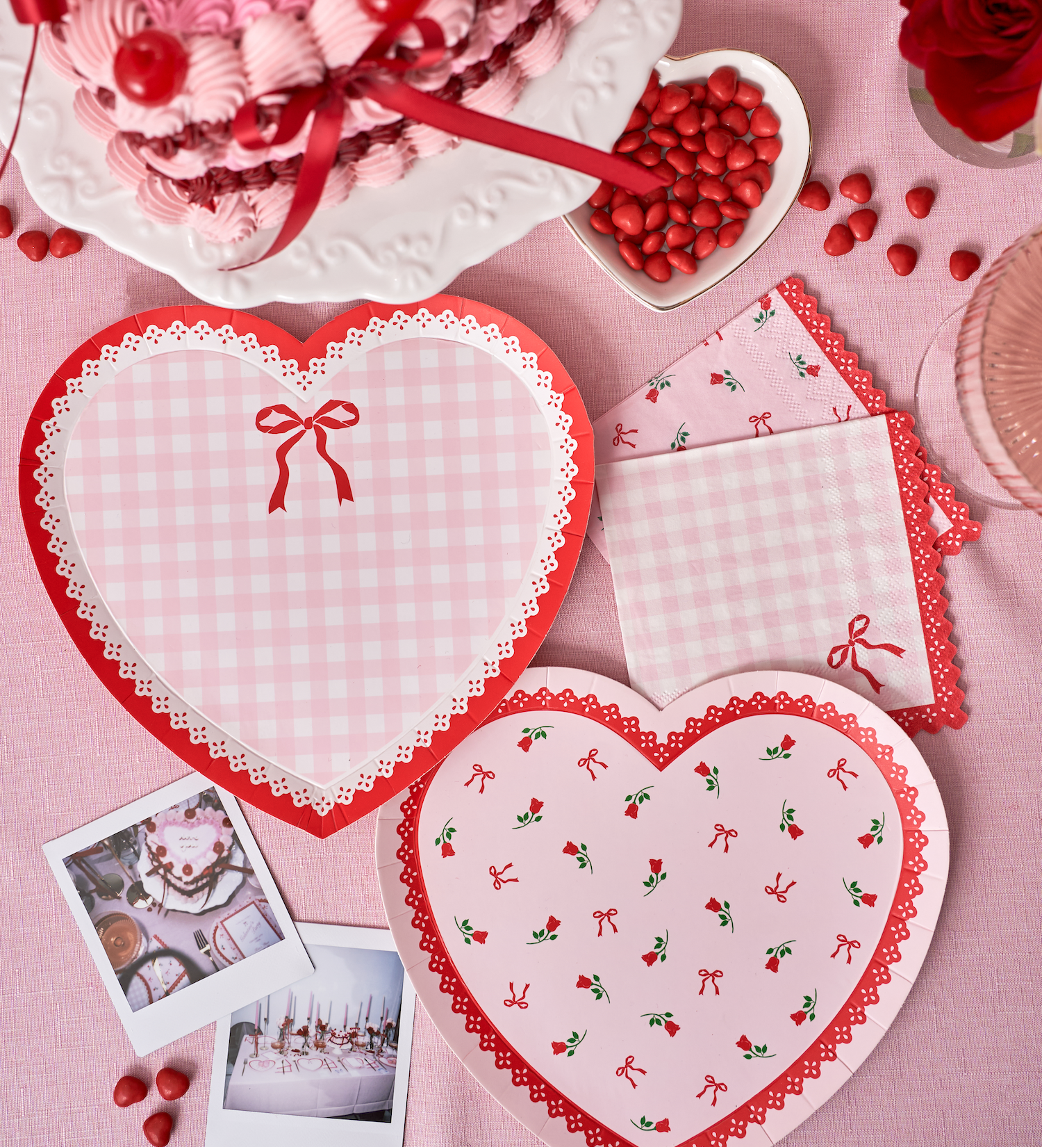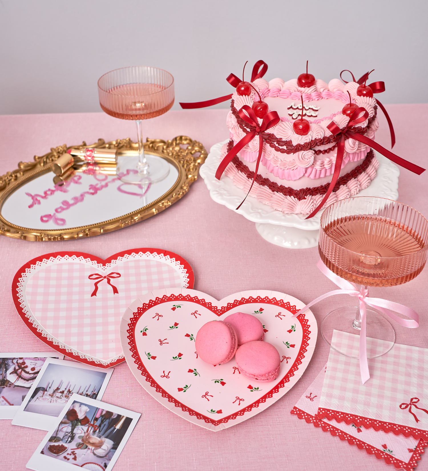 Featuring soft pinks, classic reds, and playful details like dainty florals, gingham, bows, and lace-inspired accents, this collection brings a modern coquette feel to elevated hosting.
